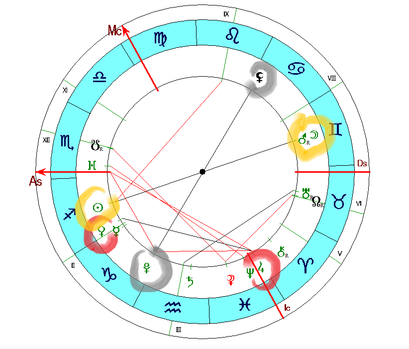 Что мы здесь видим? Точное соединение Полнолуния с ретро Марсом на Линии Близнецы (зона Меркурия, слова, информационных потоков) в оппозиции к Солнцу в Стрельце (зоне дхармы, высших истин, морали, нравственных ценностей). Пожалуй, ключевой фразой к этому Полнолунию может служить поговорка: «Слово – серебро, молчание – золото.» Потому что соединение Марс+Луна в Близнецах, может, конечно, дать хорошего оратора, но.. При условии, что он говорит правду, только правду и ничего кроме правды! Ибо Солнце в Стрельце, намного сильнее ретро Марса, да еще и в Близнецах. И можно договориться… что называется, это во-первых.