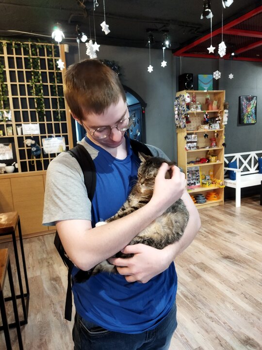 Но постепенно админ Лариса стала замечать странное: в кафе повадился ходить один парень. Придет, сядет в кресло - Ромашка к нему на колени влезет, и сидят они вдвоем часами. Никому не мешают, никого не трогают.