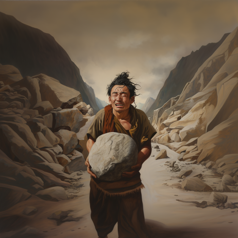 Миларепа сооружал огромные дома по поручению учителя, а затем по приказу все разрушал. Для строительства он тащил на себе тяжелые камни – один за другим. Из-за глубоких ран и увечий страдалец вызывал жалость даже у жены Марпы, но сам "переводчик" был непреклонен.